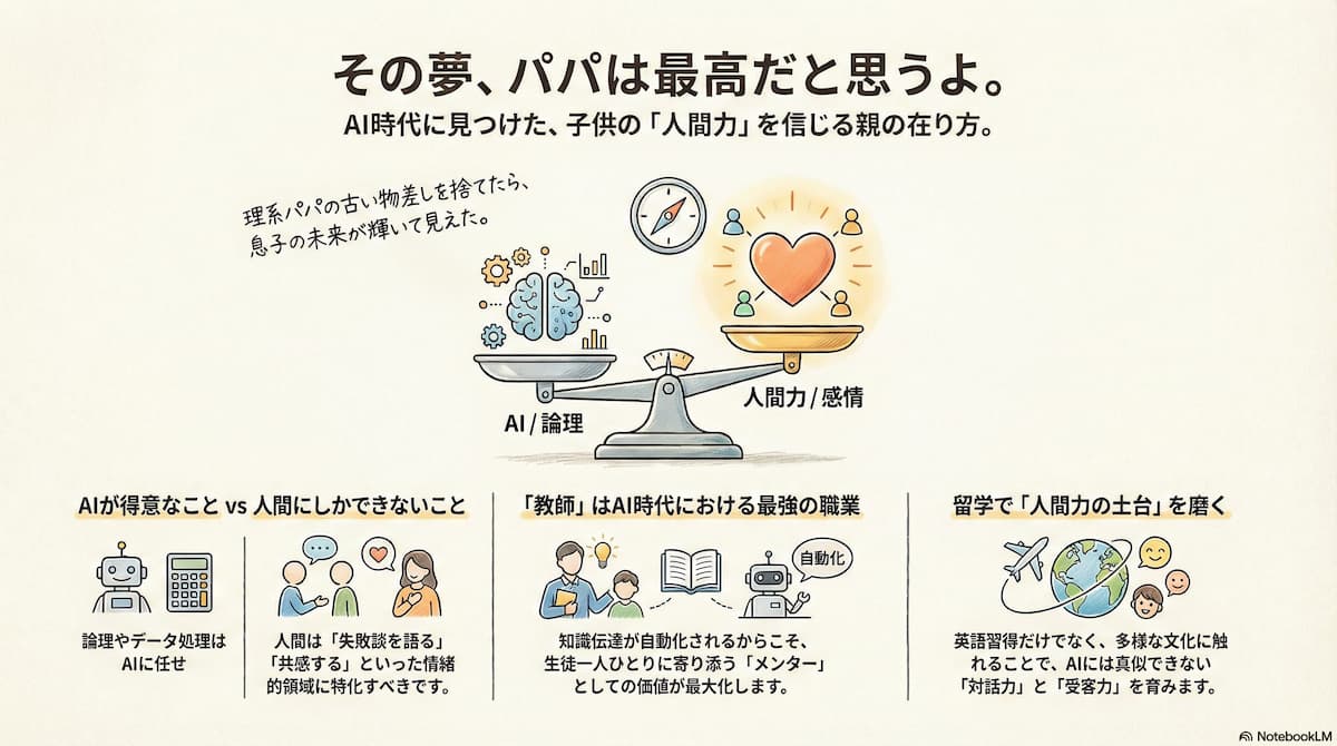 「先生になる」という息子の夢を、AI時代の「最強のキャリア」にするためには、何が必要か。 それは、AIには真似できない「人間力(対話力・受容力)」だと考えました。