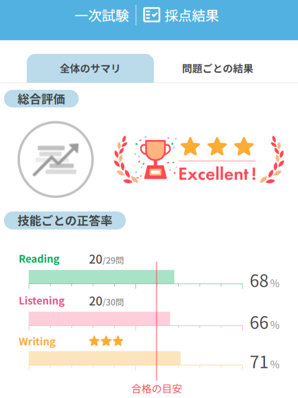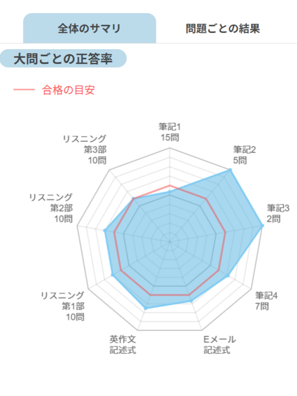 3つの技能はどれも合格の目安を超えていますが、中身を見ると「英作文に助けられているな」というのが正直なところです。