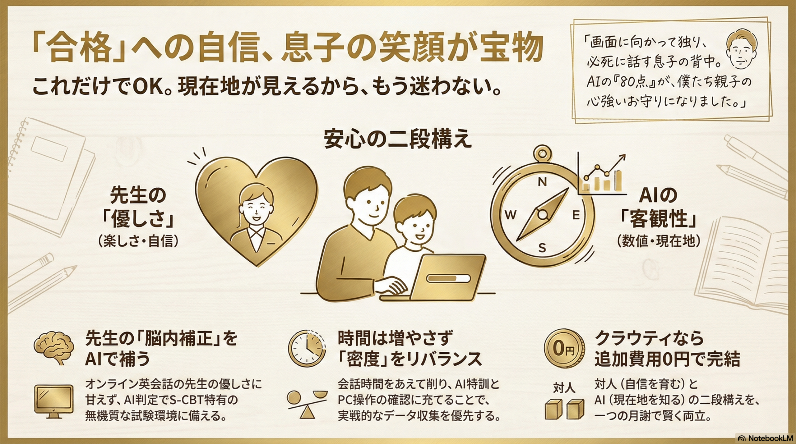 先生との「あたたかい対話」という情緒的な時間をあえて少し削り、その時間を「AIという無機質な壁に跳ね返され、安定してゴールドトロフィーをもぎ取る」という、実戦的なトレーニングに充てました。