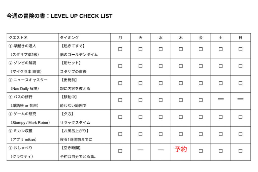 - 「単語」「動画」「英会話」が終わったら、赤ペンでチェックを入れるだけ。
