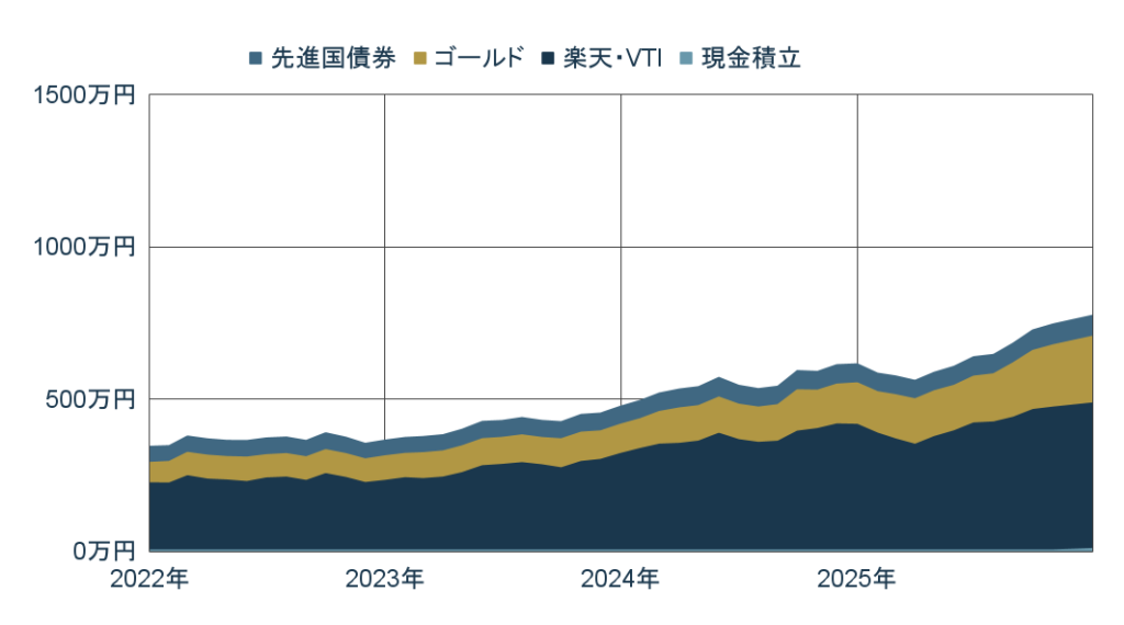今月は、米国株の堅調さとゴールドの大幅な上昇に加え、新たに開始した「月5万円の現金積立」 が加わり、資産総額は過去最高を更新しました。