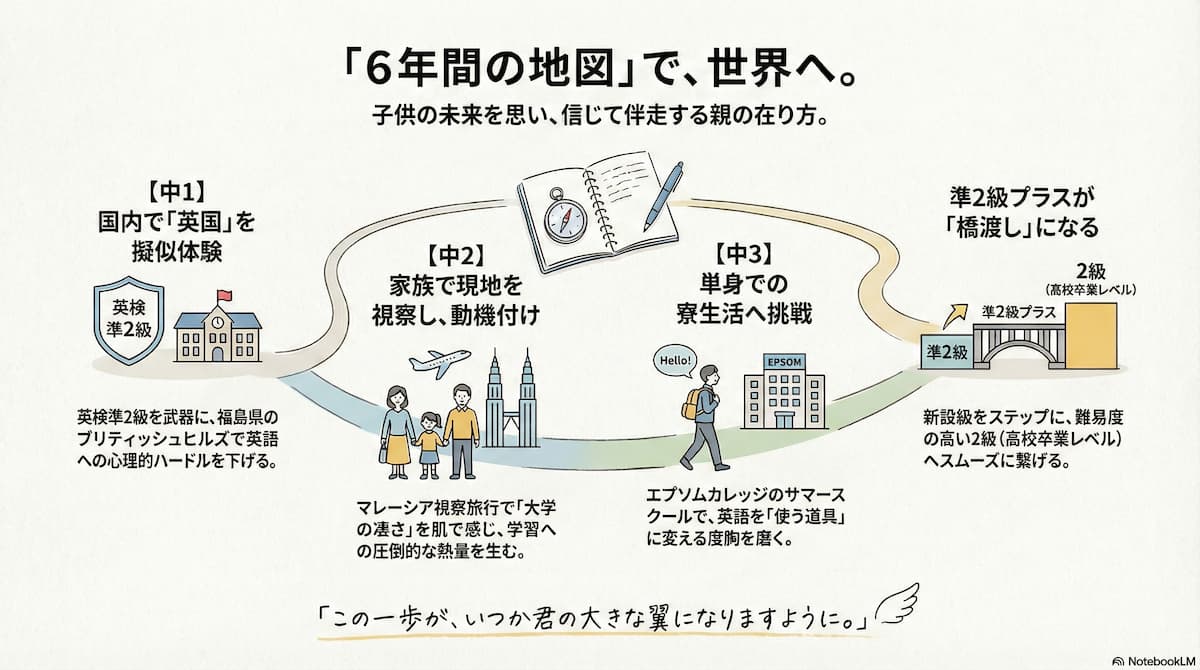 • 親の狙い: 福島県にある「パスポートのいらない英国」で、オールイングリッシュ環境を体験させます。費用約10〜20万円で、単身留学の不安を取り除くための最初のリハーサルです。