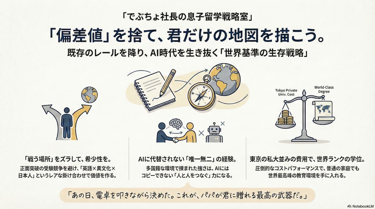 かつて就職氷河期を経験し、「偏差値」という物差しで測られてきた私。そんな「普通のサラリーマン」である父親が、「これからの時代、わが子が天才たちと渡り合い、自分らしく生き抜くための最適解は何だろう?」と電卓を叩き、悩み抜いた末にたどり着いた一つの答えです。