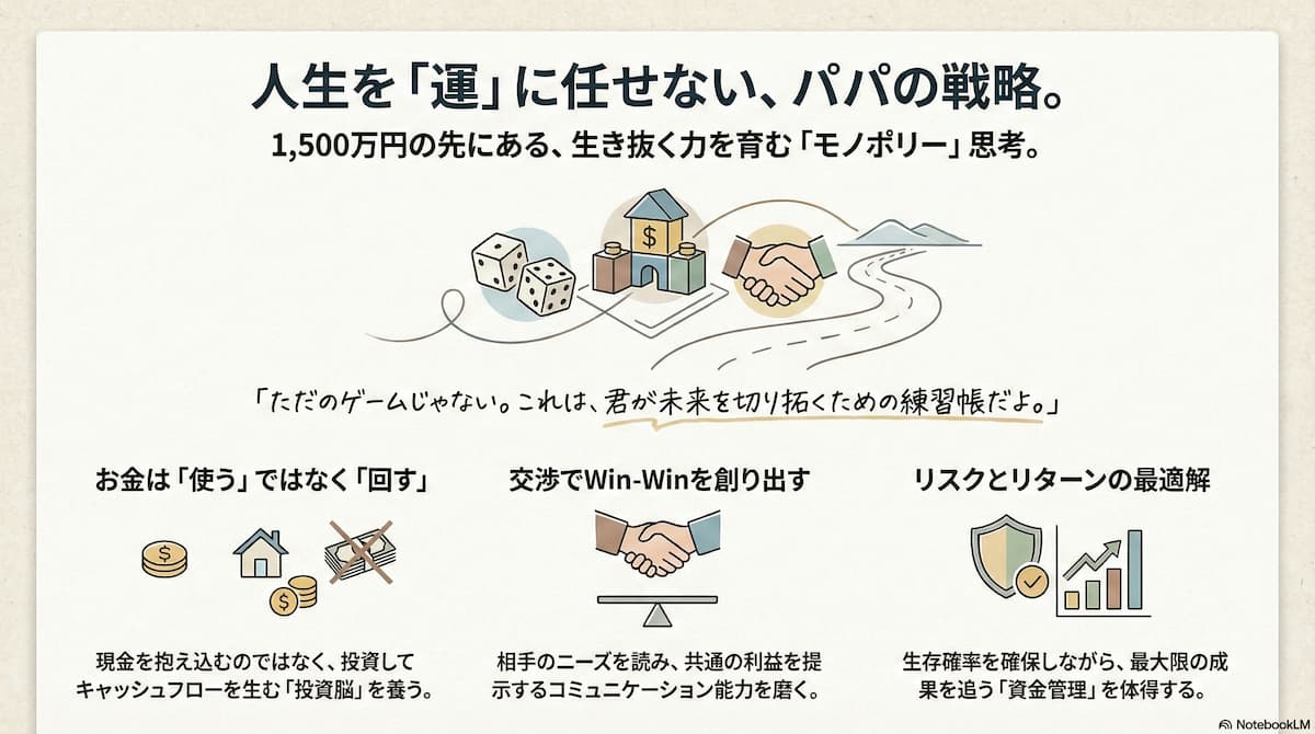 そんな思いから、わが家では週末の家族団らんに、あえて「モノポリー」というボードゲームを取り入れています。今回は、理系パパの視点から、遊びを通じた「マネー教育」の合理性について熱く語らせてください!