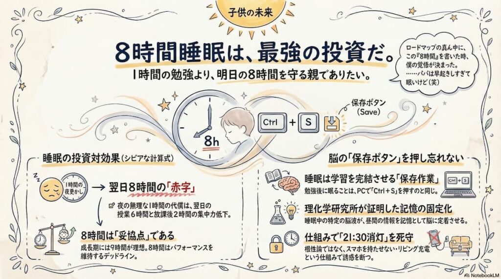 小6の息子が21:30に寝る理由。塾の競争から降り、睡眠8時間を死守する戦略を理系パパが解説。理化学研究所の研究を元に「睡眠=脳の保存ボタン」と定義。中学入学前に英語の貯金を作り、将来の睡眠時間を確保する独自の「教育投資」の全貌を公開します。