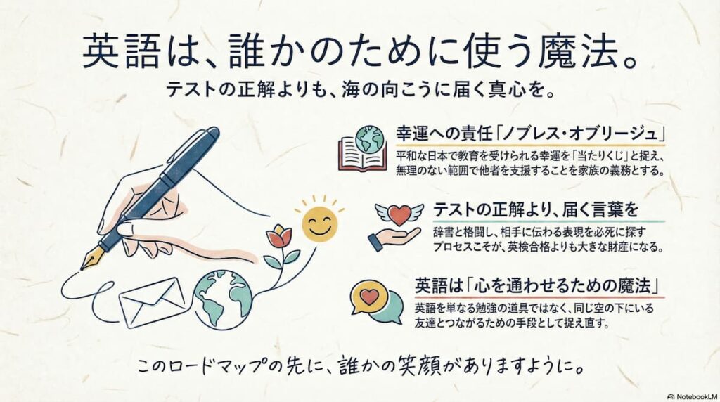 ロードマップの次は「学習ツール」の話をする予定でしたが、急遽変更します。フィリピンの支援チャイルドへの手紙で息子が気づいた「想いを伝える魔法」について。英検よりも大切な、生きた英語教育の実話です。