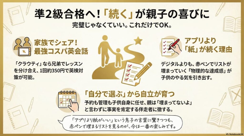 デジタル派の息子が選んだのは「紙と赤ペン」による超アナログな習慣管理術。コスパ最強のオンライン英会話「クラウティ」を兄弟シェアし、自立学習を確立した具体的な戦略を、経営者視点で解説します。【記事本文】