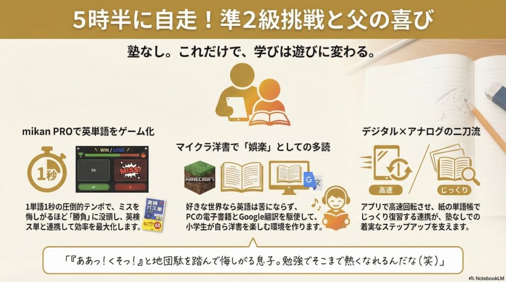 英語塾なしで英検準2級レベル。なぜ小6息子は「勉強しなさい」と言わなくても勝手に単語アプリ「mikan」と「マイクラ洋書」を開くのか?ミスすると地団駄を踏んで悔しがるほどハマる、独学の極意。