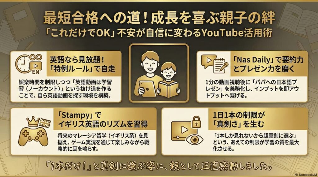 小6息子がハマる英語学習ツール【後編】。ただの動画視聴じゃない!「英語動画は時間カウント外だが、各1本まで」という独自ルールで、Nas DailyやStampyを使い倒す活用術とは?YouTubeを「ネイティブ教師」に変える方法。