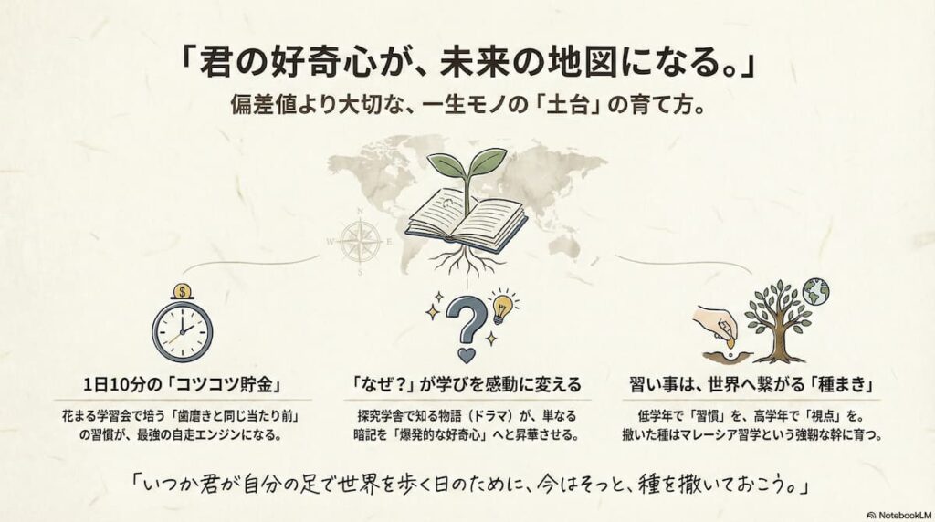 「勉強しなさい」と言わずに子供が変わった!我が家が選んだ習い事「花まる学習会」と「探究学舎」のオンライン受講口コミ。「継続力」と「好奇心」を育てる独自のメソッドと、それが今のマレーシア留学挑戦にどう繋がったかを公開します。