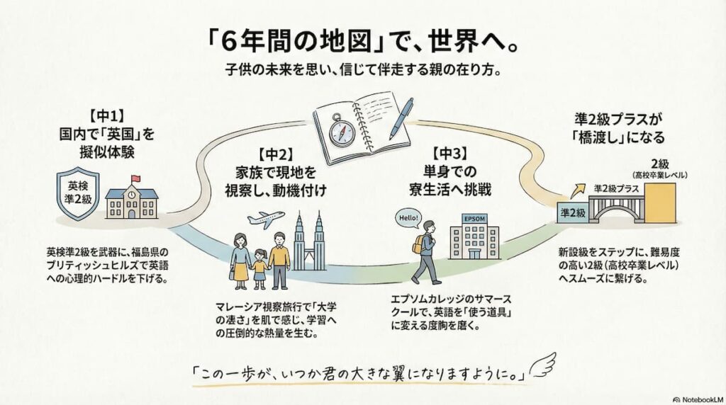 英検3級取得済みからスタート。中1の夏に準2級合格でブリティッシュヒルズへ!中2でマレーシア視察、中3で単身寮生活へ。段階的な報酬と現実的な期限を設定した、でぶちょ家の中学3年間戦略を全公開。
