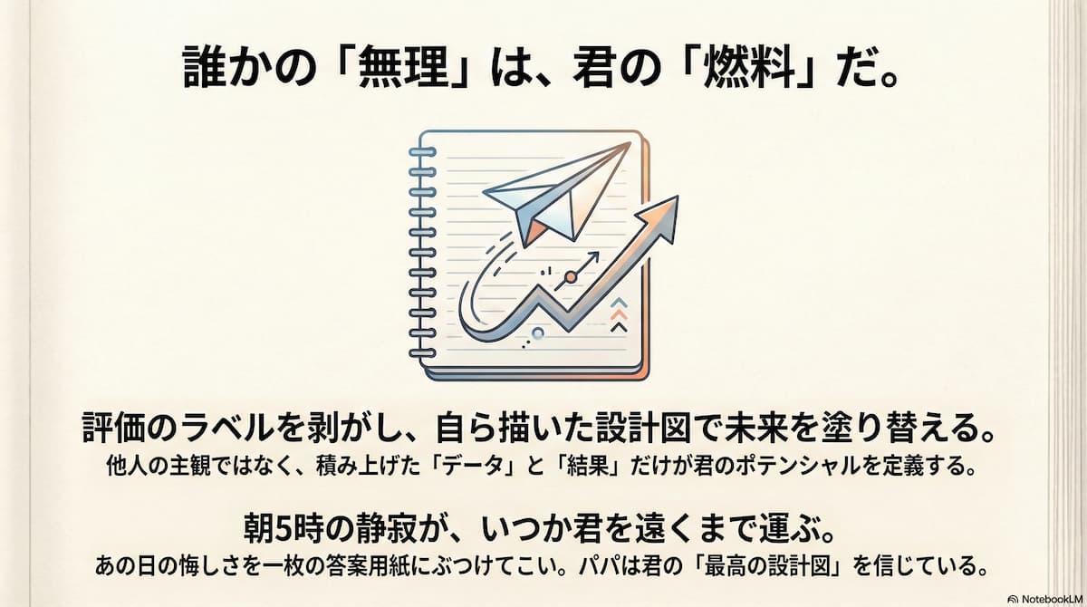 「彼だけじゃない」ことを、証明しに行こう。 パパは、君の「最高の設計図」が、現実を塗り替える瞬間を信じている。