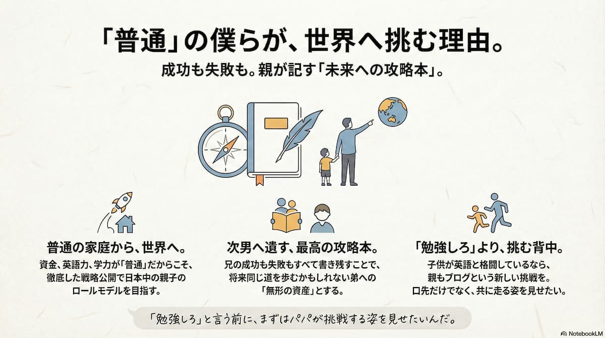 もし、こんな「普通のスペック」の我が家が、戦略だけで海外進学を達成できたら? それは、「日本中の親子の希望(ロールモデル)」になるんじゃないかと思ったんです。