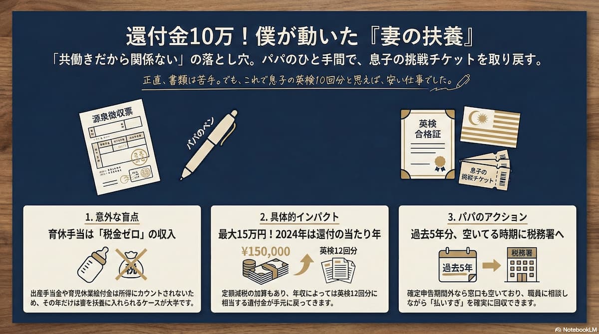 結論から言うと、共働きでも妻の収入が減る年だけは、私の「扶養」に入れることができたんです。これで数万〜10万円くらいの税金が戻ってきました。